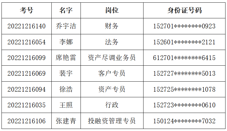 按照《鄂尔多斯市康巴什区国有资产投资经营有限责任公司2022年社会公开招聘公告》相关要求,经发布公告、资格审核、笔试、面试、体检等环节,现将拟聘人员名单公示如下(排名不分先后)。