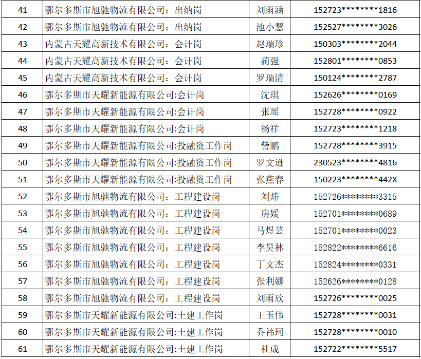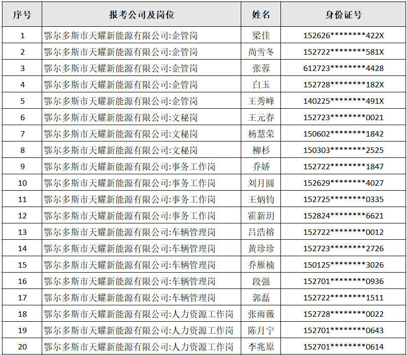 内蒙古天耀能源有限公司2023年社会公开招聘笔试考试于2023年3月26日顺利完成,现将入围人员名单公示如下,同时请以下考生按时参加面试考试。