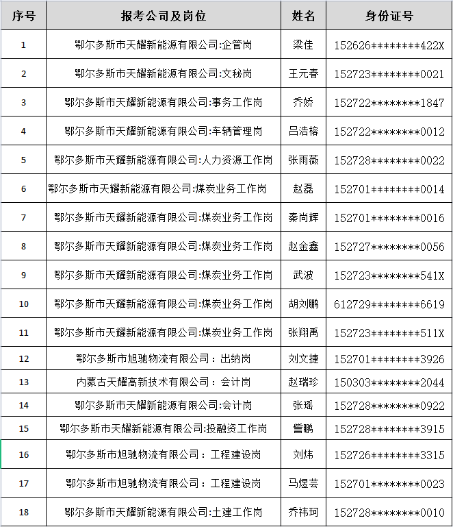 按照《内蒙古天耀能源有限公司2023年社会公开招聘公告》相关要求,经发布公告、资格审核、笔试、面试、体检等环节,现将拟聘人员名单公示如下(排名不分先后)。