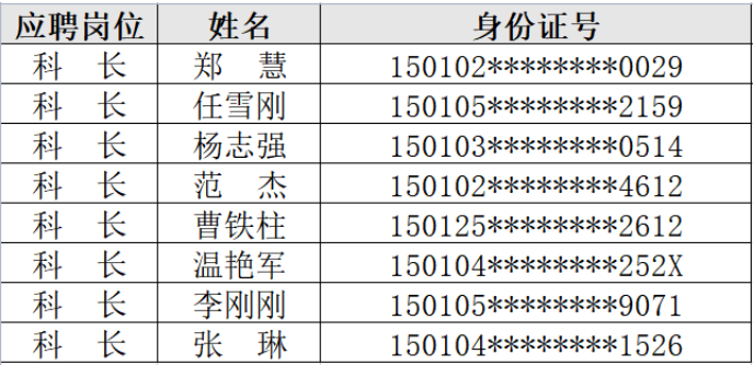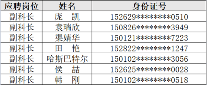 二、副科长岗位拟入围人员名单(排名不分先后。按照竞争上岗方案,副科级竞聘入围人选为7人。考虑中储粮内蒙古分公司正在招录职员,若此7人中有被分公司录用的情况,按竞聘总成绩依次递补。):