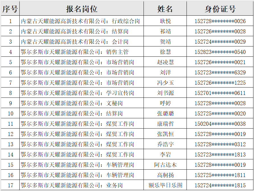内蒙古天耀能源高新技术有限公司鄂尔多斯市天耀新能源有限公司2024年社会公开招聘面试考试于2024年2月2日顺利完成,现将入围考生名单公示如下,同时请入围考生按要求进行体检。