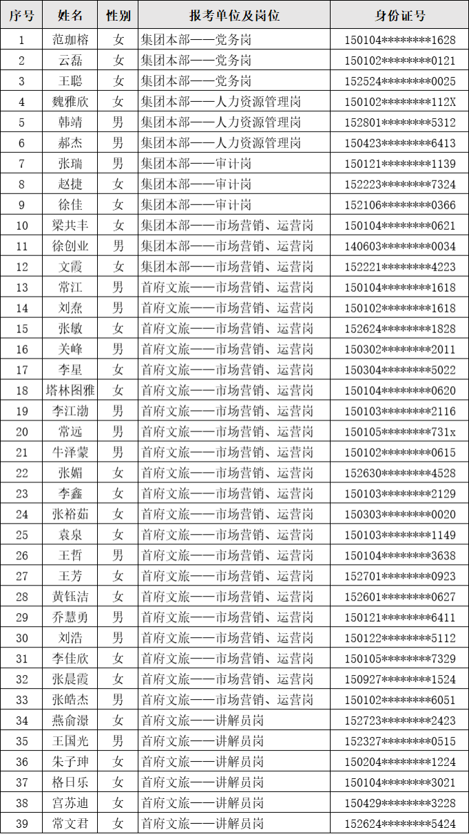 呼和浩特市文化旅游投资集团有限公司2024年公开招聘,笔试考试于2024年3月31日顺利完成,现将入围面试人员名单公示如下,同时请以下考生按时参加面试考试。